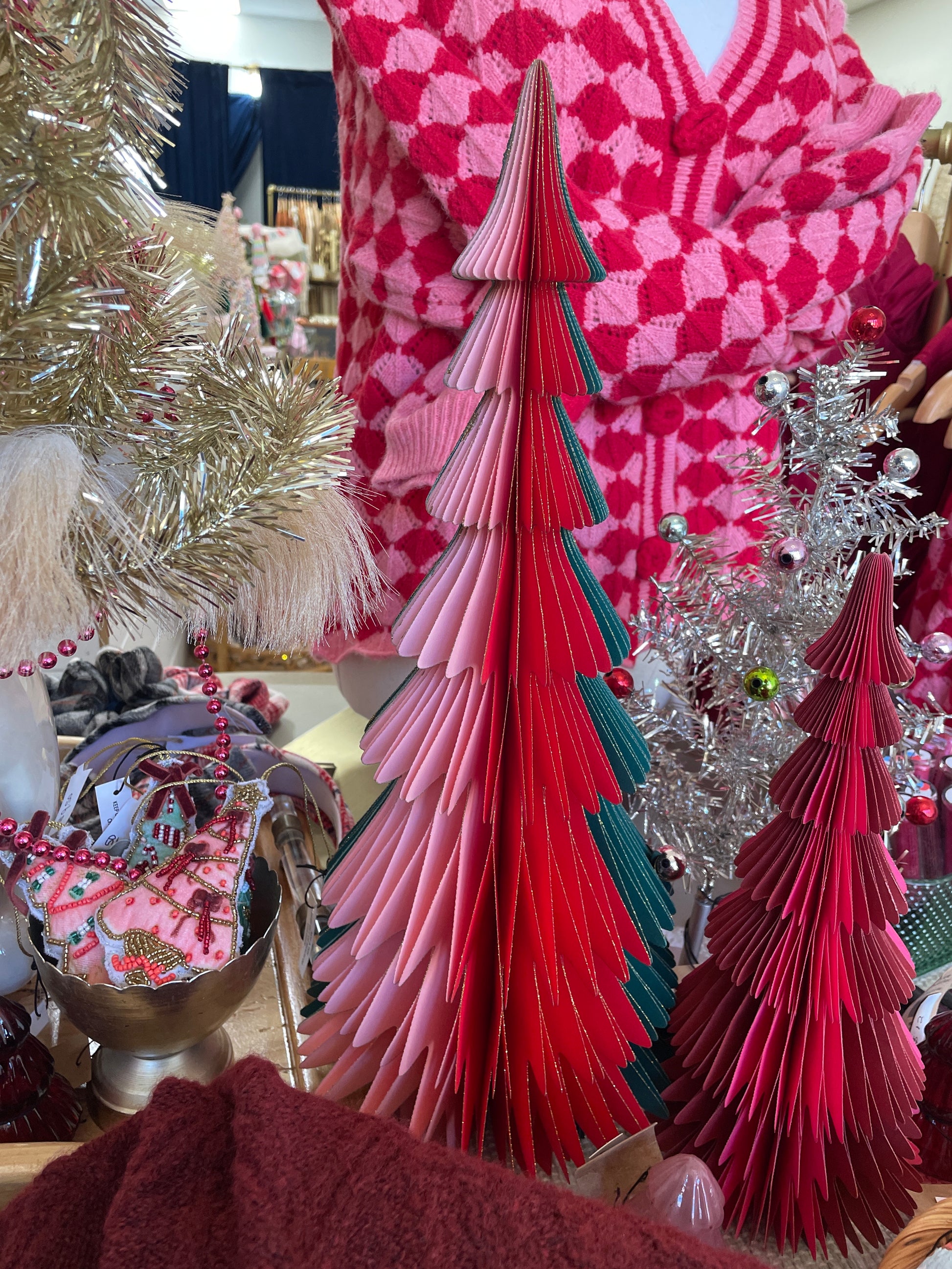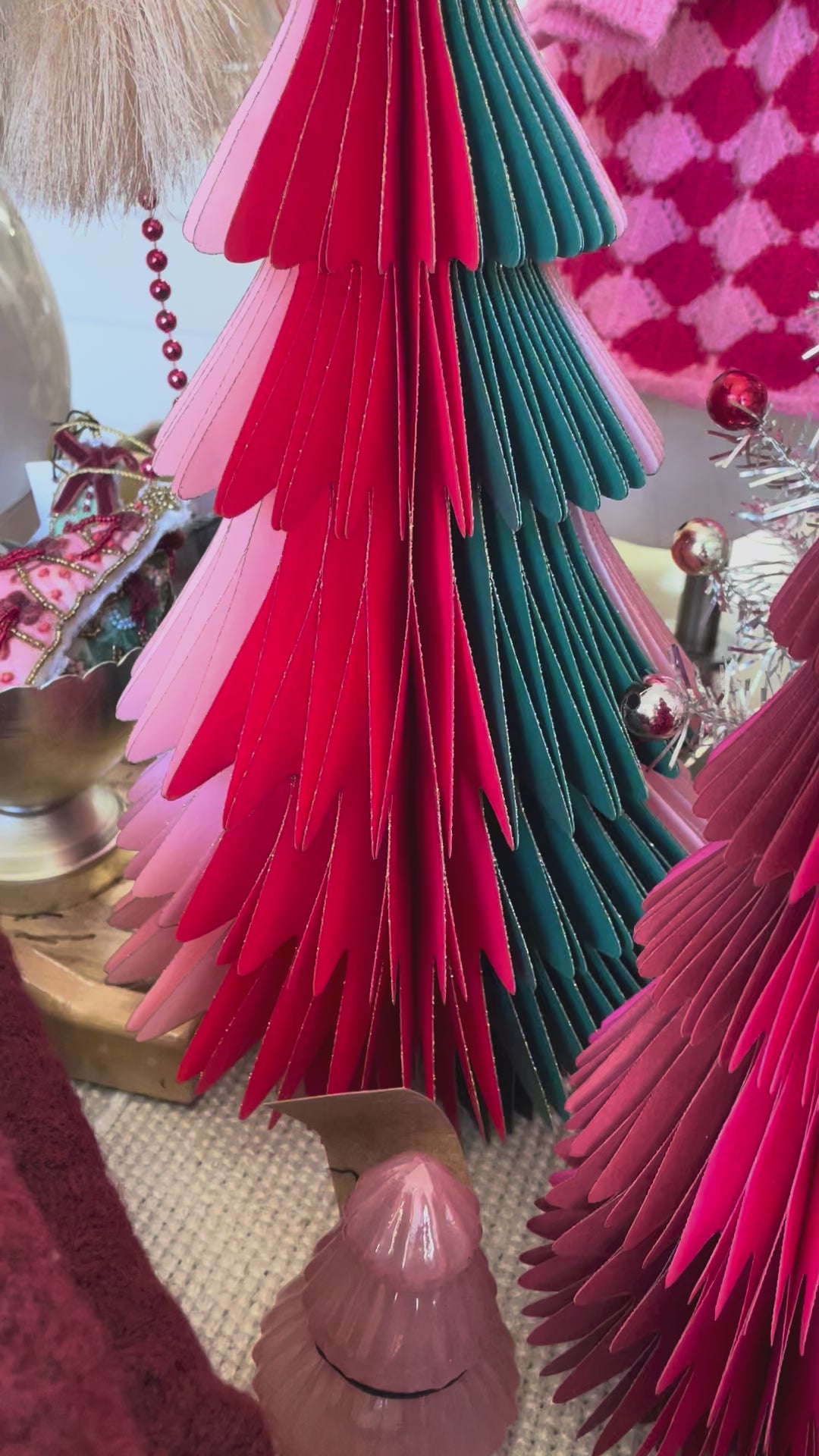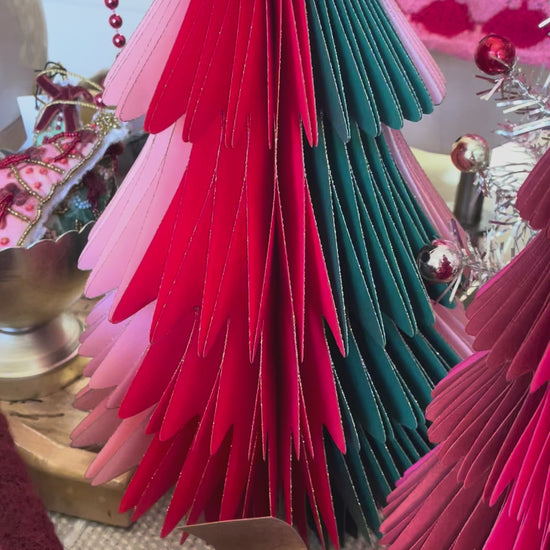 This 18-inch handmade folding honeycomb tree features a unique gold glitter edge, adding a touch of elegance to your holiday decor. Easy to fold and store, this tree is the perfect addition to any festive gathering or home. Each tree is carefully crafted for a one-of-a-kind design.