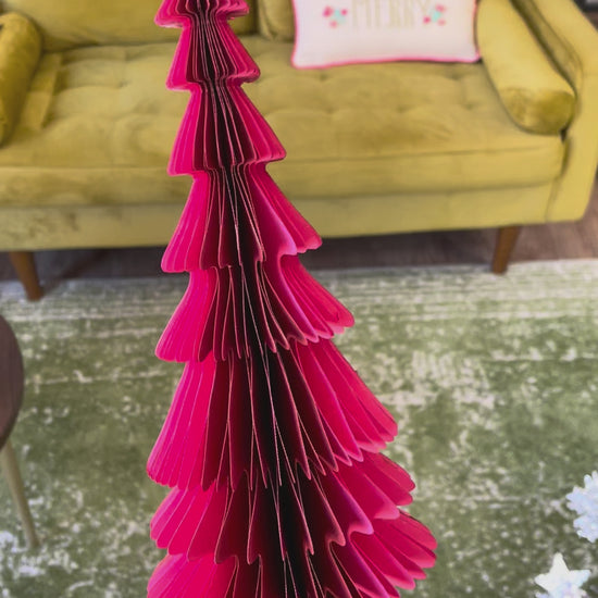 This 12" honeycomb tree, handmade with pink and red accents, brings a touch of charm to any room. The unique folding design adds versatility and can be easily stored when not in use. Perfect for adding a pop of color to your decor.